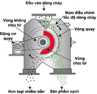• Drum Separator có một vòng từ 1800 hình quạt, đó là khu vực chịu từ, một nửa không gian còn lại hoàn toàn không bị từ hóa. Khi vật liệu rơi xuống bề mặt vùng chịu từ, các chất gây ô nhiễm kim loại sẽ bị thu giữ phía trên bề mặt chịu từ trong khi vật liệu tiếp tục được đi qua. Khi phần quay cố định, chất gây ô nhiễm sắt sẽ đi theo quỹ đạo của nó đến phần không bị từ hóa và do đó nó thải ra ngoài.